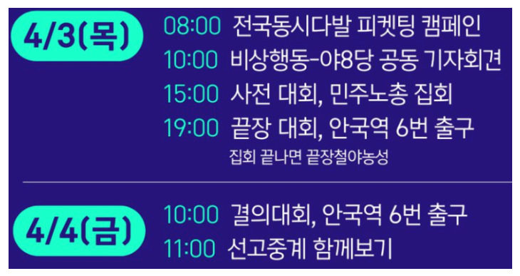 시민 발언, 공연, 그리고 밤샘 철야농성으로 이어지는 일정이 예정되어 있어요.